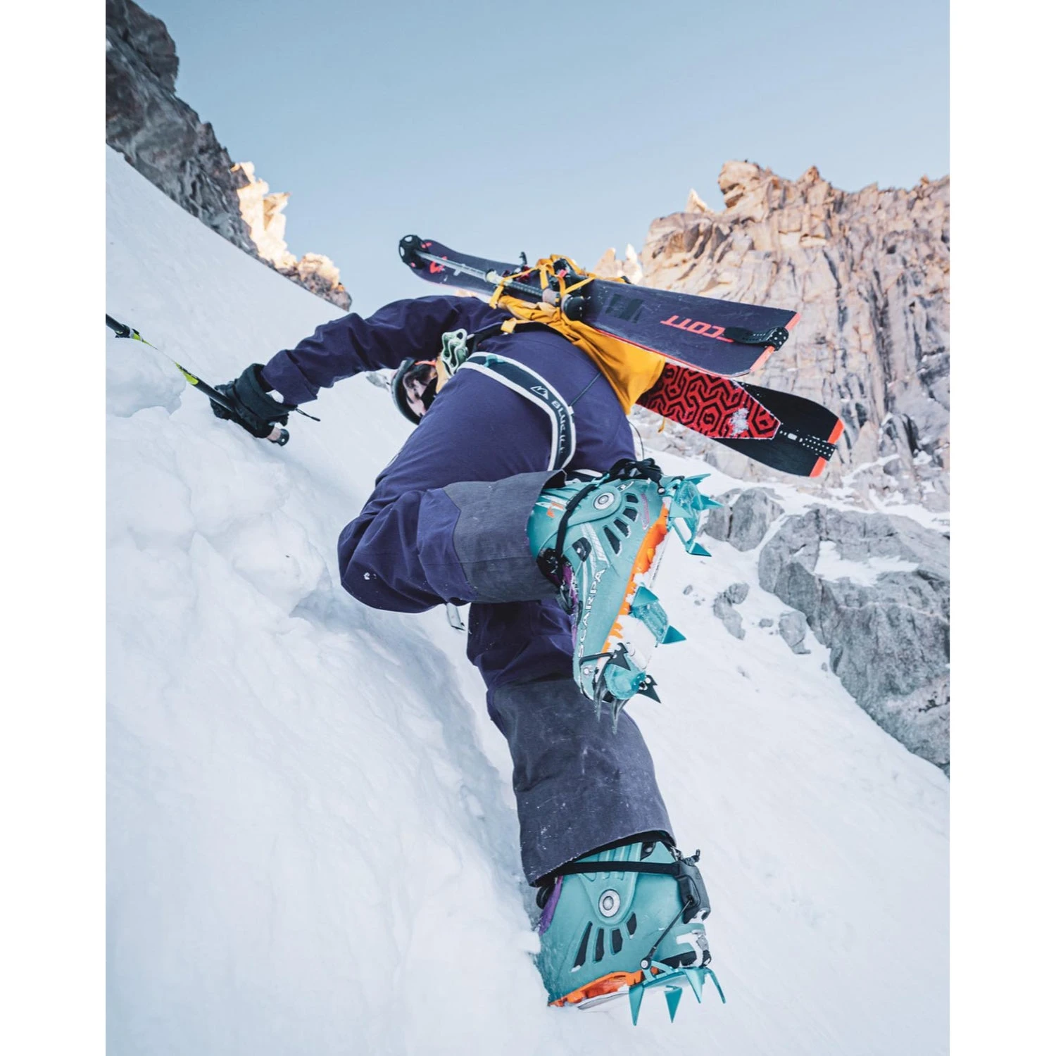 This patented concept design by Blue Ice is based on a central textile strap that connects the front and back sections and allows it to mount in a suitable position based on the application or geometry of your boots. Capable of accommodating a wide range of boot sizes. The flexible strap connecting the system reduces bulk and offers superior compactness while providing remarkable precision and comfort.