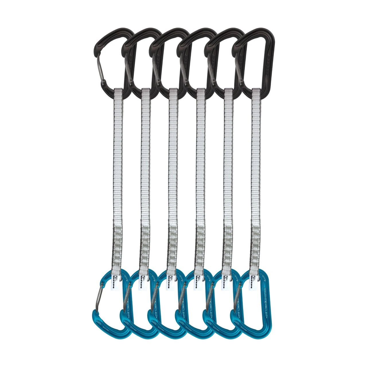 - Contrasting carabiner colours identify rope and gear ends of quickdraw